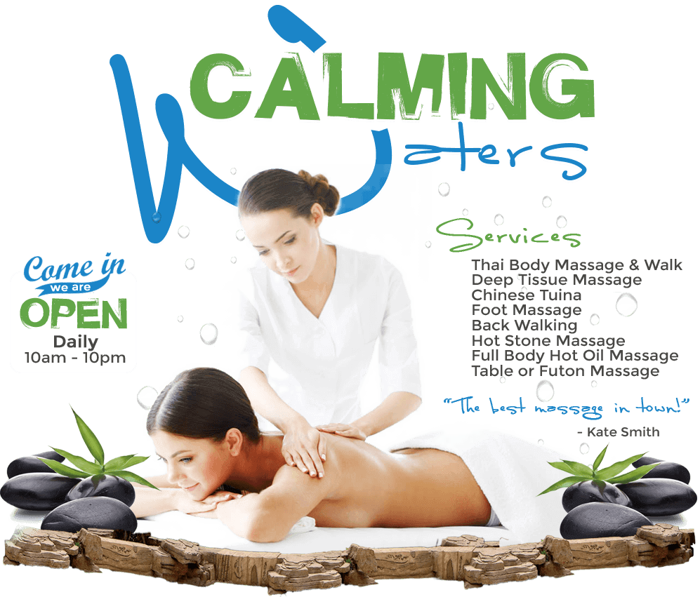 | Welcome to Calming Waters Massage & Spa! At Calming Waters we take quality very seriously, providing a personalized, handcrafted, and therapeutic massage in a clean and relaxing environment. But don't take our word for it, read what real clients are saying about Calming Waters here.